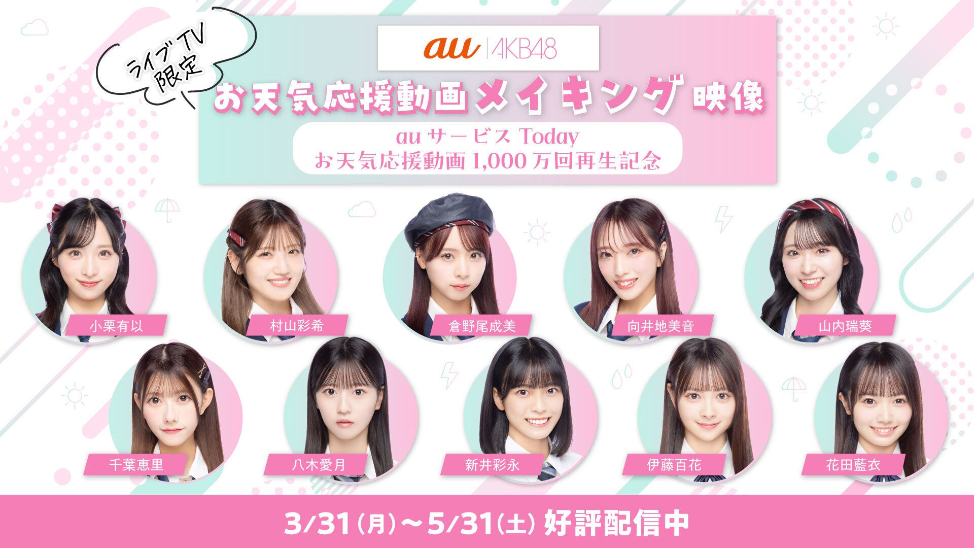 AKB48のお天気応援動画は、KDDI株式会社と株式会社Gunosyが提供している「auサービスToday」において、「日々のお天気情報をもっと楽しく」をテーマにAKB48のメンバーが出演し、2024年12月から限定配信し、2025年2月に1,000万再生を突破しました。
