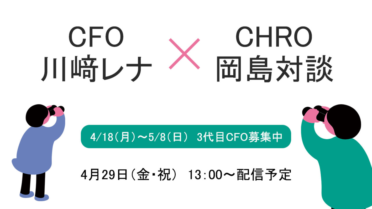 4/29(金・祝)に行う対談では、CFOおよびフューチャーサミットメンバーへのエントリーを検討する10代向けに、現(2代目)CFO川﨑とCHRO岡島が以下テーマで対談します。