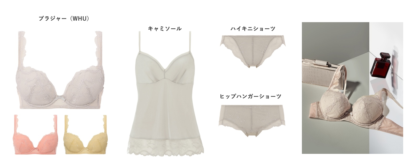 幅広い年齢層の女性たちから支持を得る、透明感が美しい、繊細なストレッチリバーレースをふんだんに使用した人気のシリーズに新色を追加。この春は、ゴールドに加え、ピンクとグレーがエントリーしました。