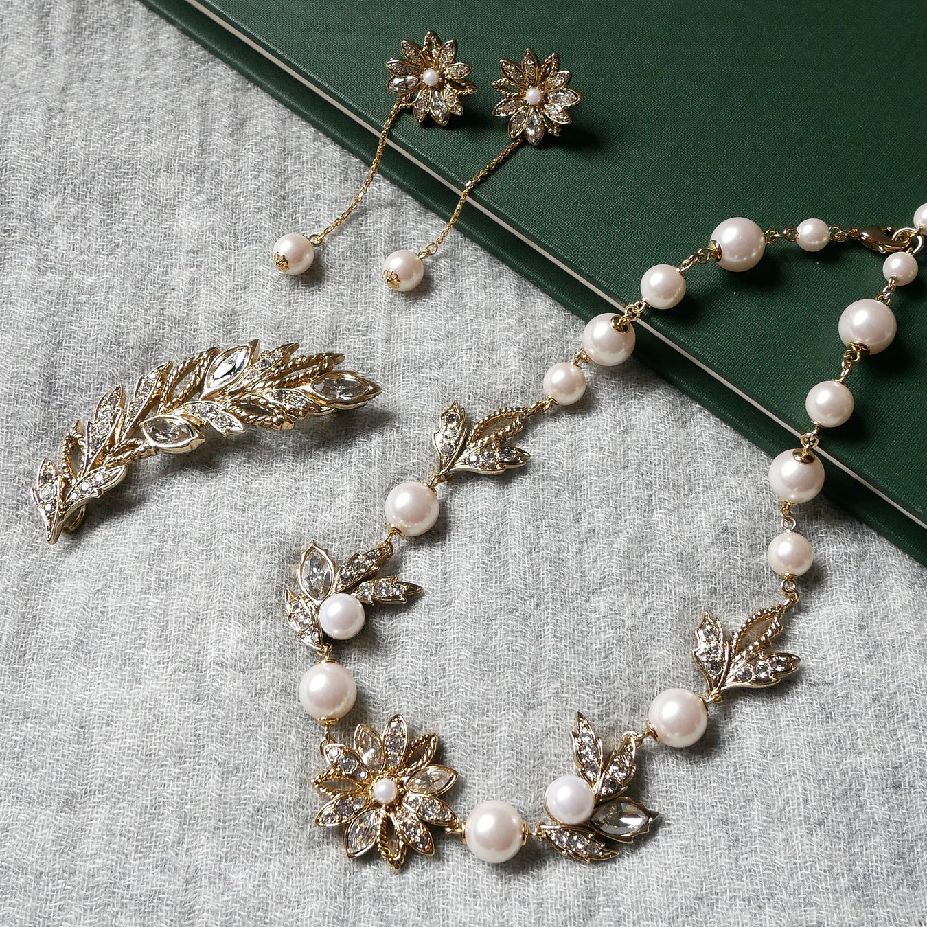 花びらや葉を象ったパーツに大小さまざまな大きさのカットガラスを散りばめ、艶やかなパールを組み合わせました。