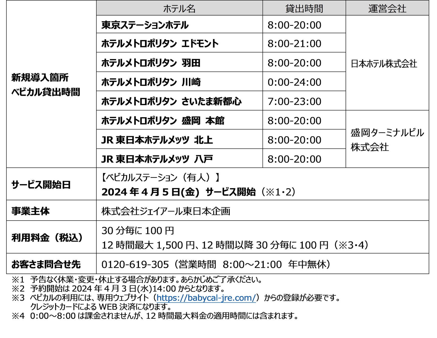 ◆4月5日より、日本ホテル株式会社(JR東日本グループ)が運営するホテルのうち新たに5ホテル、盛岡ターミナルビル株式会社(JR東日本グループ)が運営するホテルのうち3ホテルでベビカルのサービスを開始します。宿泊の方だけでなく、ホテル最寄り駅を訪れる子育て世帯の快適なお出かけやご旅行をサポートいたします。このうち、東京ステーションホテルでは、小さなお子さまに人気の新幹線「E7系かがやき」モデルベビーカーをレンタルいたします。