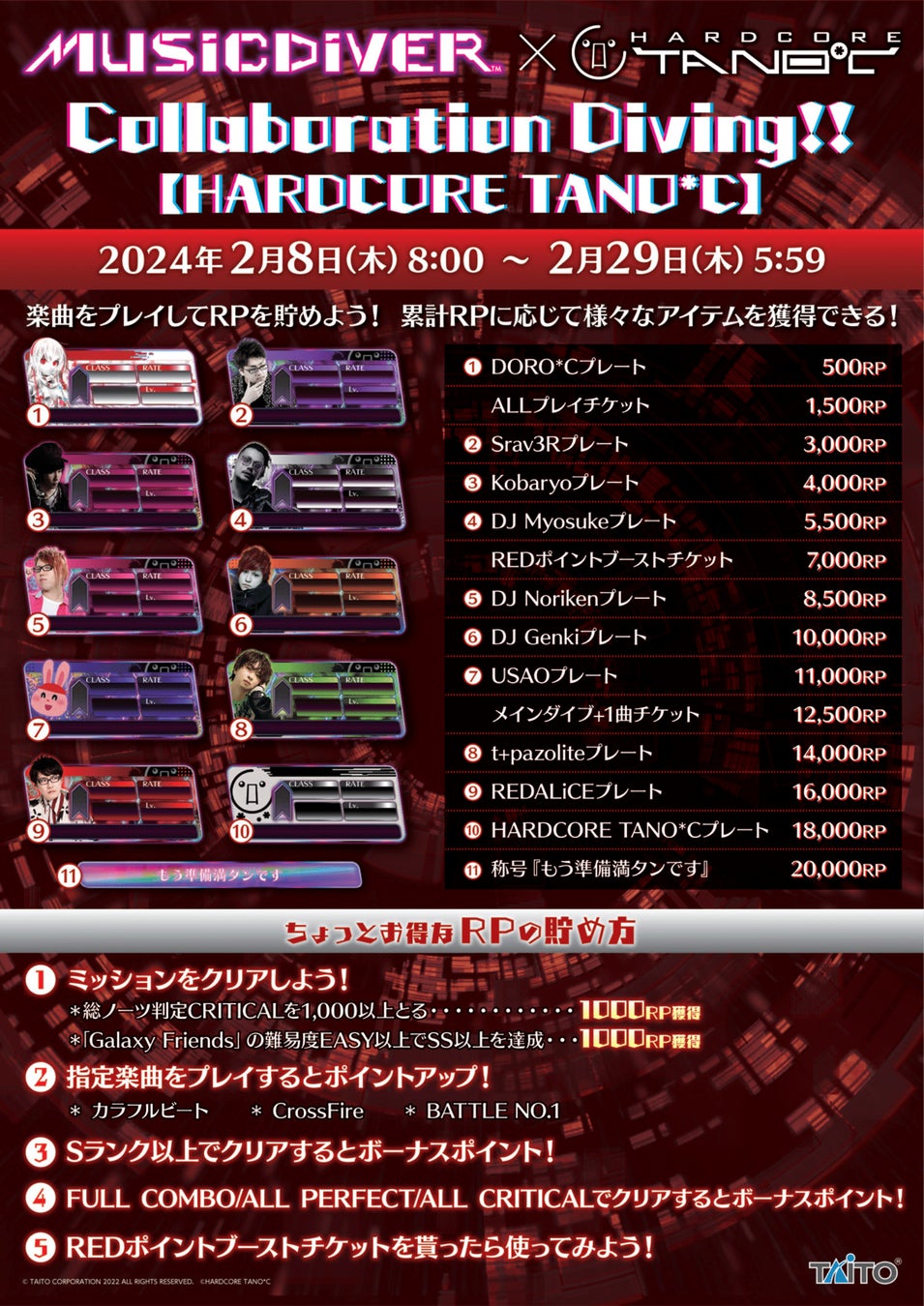 楽曲をプレイすることでポイント(RP)を貯めることができ、累計RPポイントに応じて様々なアイテムを獲得することができます。「Collaboration Diving!!【HARDCORE TANO*C】」では、「HARDCORE TANO*C」メンバーの写真がデザインされた限定プレートや、称号「もう準備満タンです」などを獲得することができます。プレートや称号は装着することでプレイヤープロフィールをコーディネートすることができます。