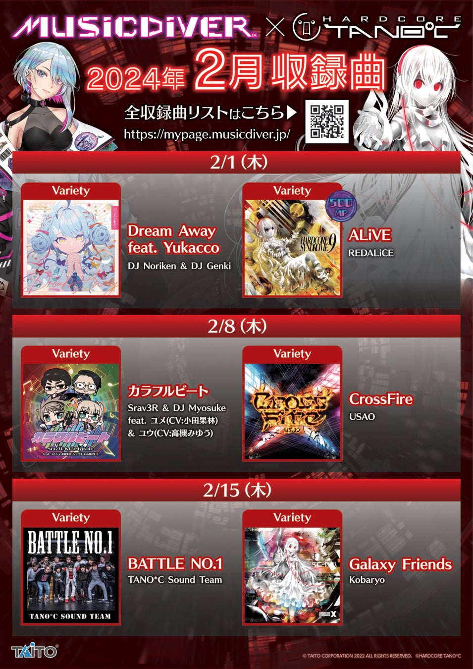 2024年2月は、「ALiVE / REDALiCE」、「Dream Away feat. Yukacco / DJ Noriken & DJ Genki」を第1弾に、「HARDCORE TANO*C」制作の人気楽曲6曲が追加されます。
