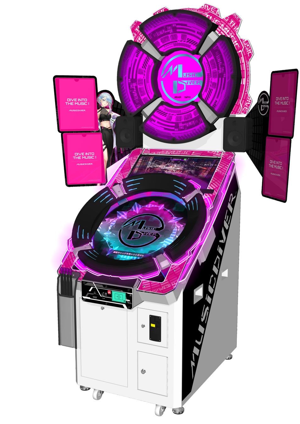 『MUSIC DIVER(ミュージック ダイバー)』は、楽器を演奏するようにスティックを使ってプレイするアミューズメント施設向けの音楽体感演奏ゲームです。付属のスティックを使って直感的なプレイが可能で、楽器を演奏しているような臨場感をお楽しみいただけます。EDMの他、ポップスやアニメソングに『MUSIC DIVER』オリジナル楽曲などをラインナップ。毎月楽曲の追加を予定しており、音ゲーファンの皆様に永くお楽しみいただけます。