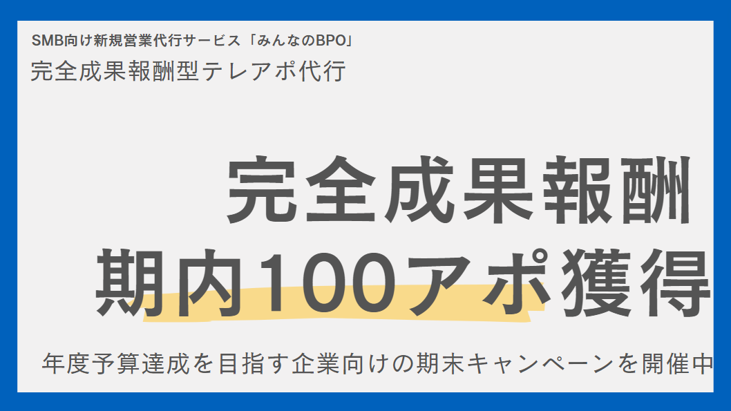 「みんなのBPO」にて【完全成果報酬型・期内100アポ獲得キャンペーン】を開始。期末に向けた予算達成をご支援します。