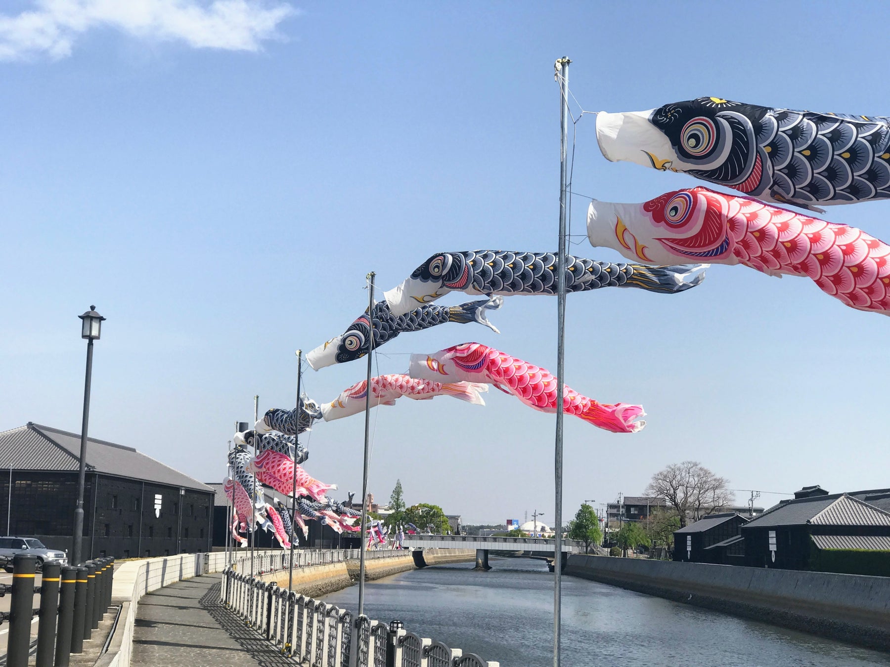 運河と黒板囲いの蔵を背景に鯉のぼりが泳ぐ姿はなんとも絶景!遊歩道沿いに鯉のぼりが設置されているので、小さなお子様連れのご家族にも安心です。ゴールデンウイークのお出かけ先にぜひどうぞ!
