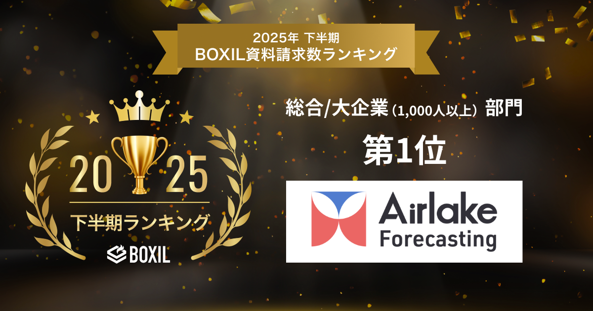 株式会社DATAFLUCT(本社所在地:東京都渋谷区、代表取締役CEO:久米村 隼人、以下DATAFLUCT)が提供する「Airlake Forecasting」は、スマートキャンプ株式会社(以下「スマートキャンプ」)が主催する「2025年下半期 BOXIL資料請求数ランキング」の需要予測システムカテゴリにおいて「総合1位」および「大企業部門1位」(※1)に選出されました。