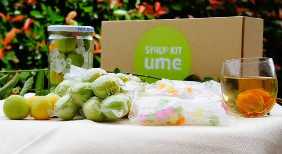 冷凍により梅の繊維が壊れることで、より香り高く味の濃いシロップを作ることができます。大きさや見た目にもこだわった瓶を取り寄せ、キットとして販売しています。