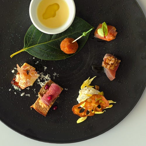 紫芋や葉山牛のリエットで作ったクロケッタ(コロッケ)や、茄子と茗荷とバルサミコのヴィネグレットソースで味わう旬魚の燻製、しらすと山芋の白和えなど約7種を彩り豊かに盛り合わせました。