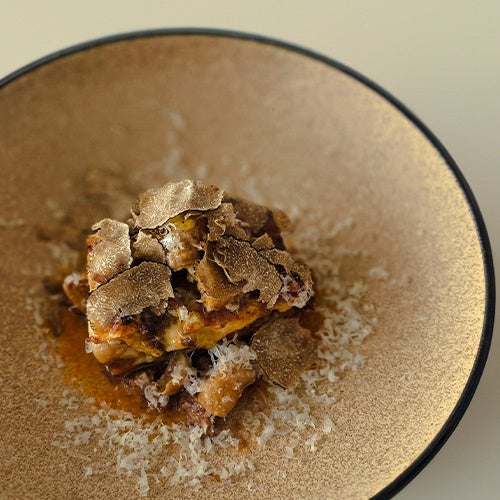 “幻の牛”と称される葉山牛のラグーに、芳醇なポルチーニ茸を合わせたラザニア。仕上げには、香り高い秋トリュフを贅沢に削りあげ季節を彩ります。