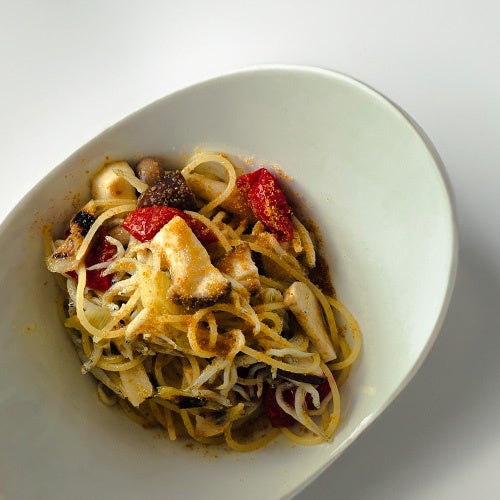 地元湘南のしらすに、香ばしくグリルしたネギと、しめじ・椎茸・エリンギなどの秋が旬の茸をあわせ、唐墨で仕上げたオイルベースのパスタ。
