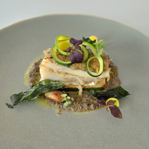 秋茄子のペーストを挟み、炭火でじっくりと焼き上げた太刀魚に、ズッキーニのソテーとリコッタを重ねた一皿。魚の旨味を凝縮した出汁とタプナードソースが、香ばしさと繊細な風味を引き立てます。