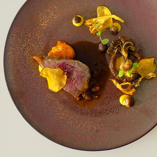 芳醇なマディラワインと旬の柿を用いたオリジナルソースで味わうイベリコ豚のロースト。さつまいもや舞茸、椎茸、しめじなど、秋の実りをふんだんに添えた季節感あふれる一皿。