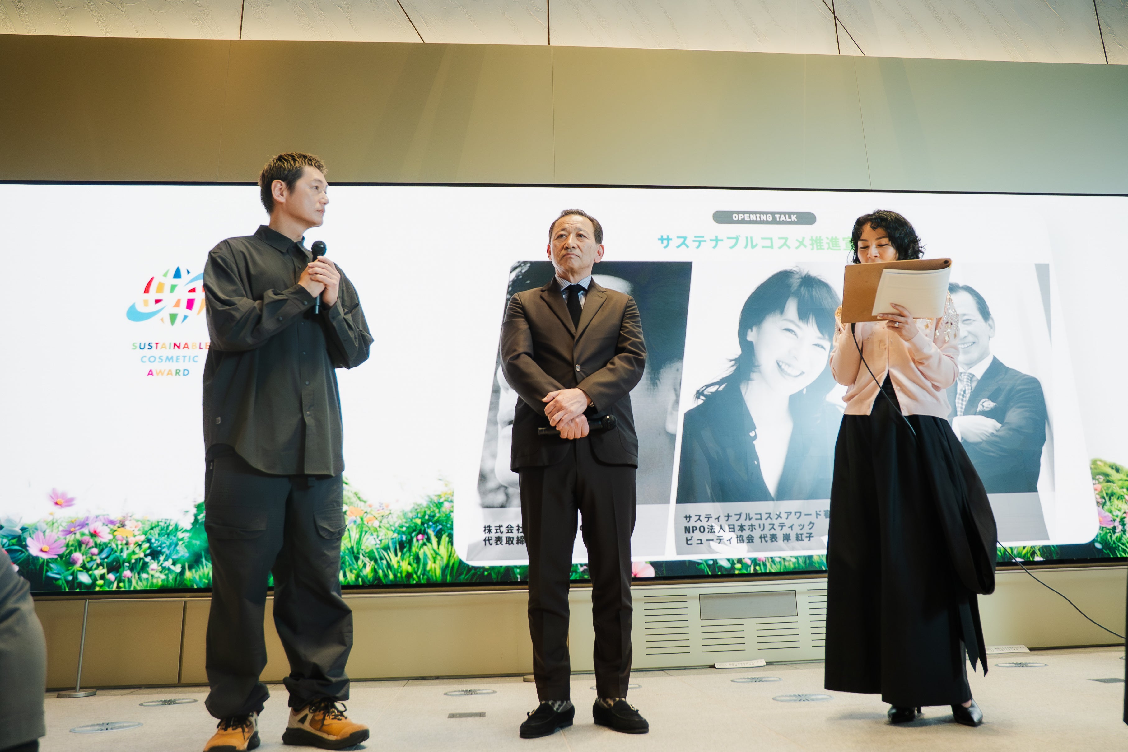 表彰式は、株式会社ルミネ代表取締役社長 表輝幸氏、循環型パーソナルケアブランドKruhiファウンダーで俳優としても活動する井浦新氏、サステナブルコスメアワード審査員長 岸紅子氏によるオープニングトークからスタートしました。