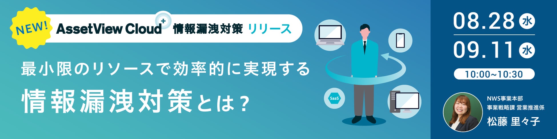 この度、AssetView Cloud + に新たに追加された「情報漏洩対策」についてのセミナーを開催いたします。本セミナーでは、AssetView Cloud +の全体像から、リリースされたばかりの「情報漏洩対策」機能の詳細まで、分かりやすく解説いたします。
