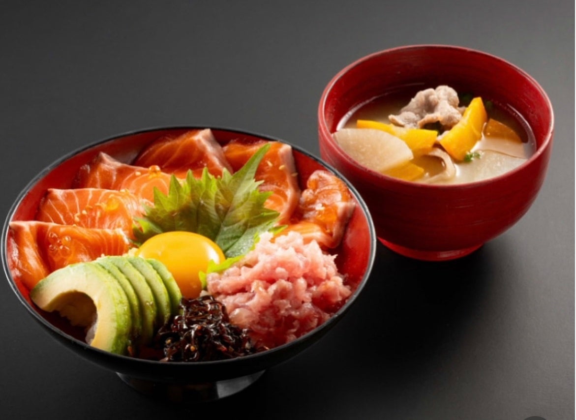 上質な脂のふくいサーモン、トロ、アボカドに卵黄を絡めて味わう丼と、風味豊かなふくいポークの豚汁セットは贅沢で、幸せいっぱいになります。美味しい!