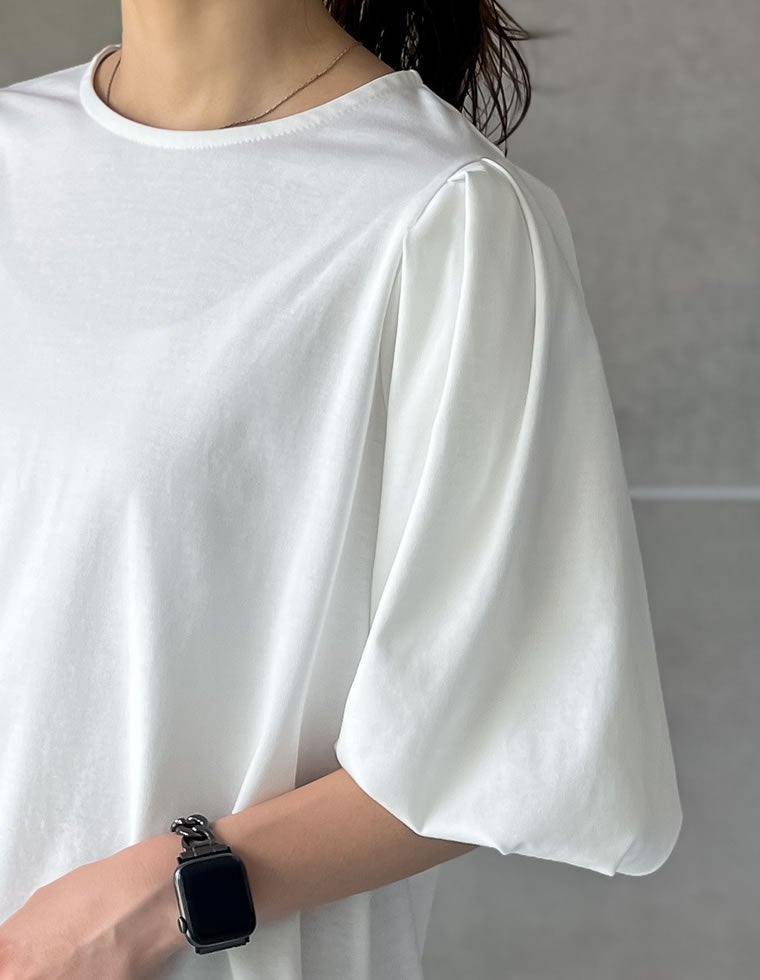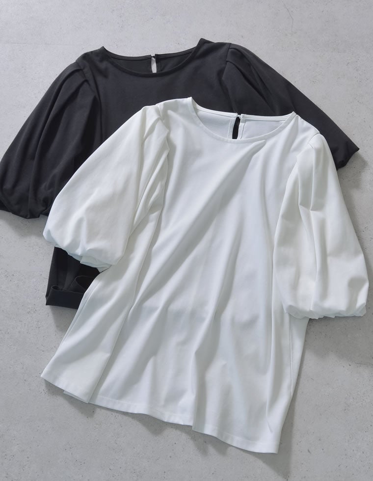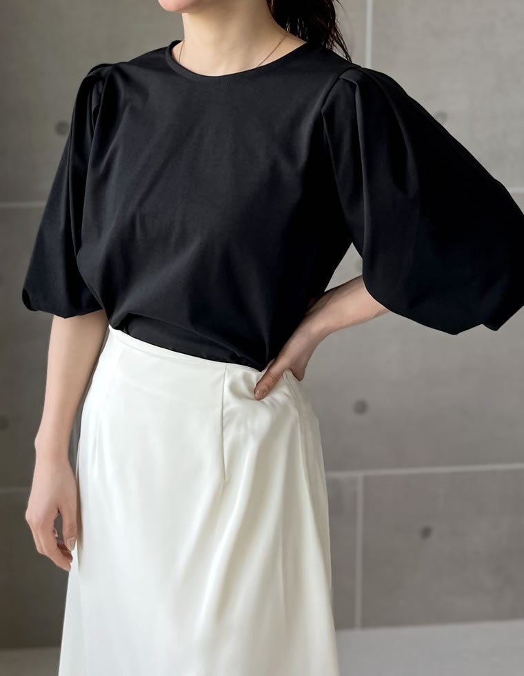二の腕をすっぽりカバーする袖丈は、裾にバルーンデザインを施したことで、品のあるボリュームシルエットを実現。肩回りにはインタックを施し、美しいドレープを描きます。