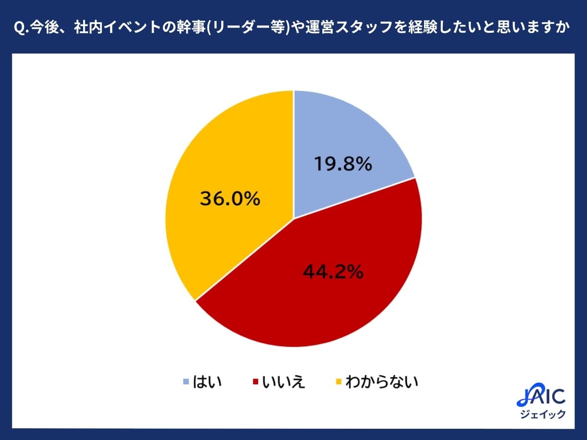 冒頭の幹事経験を問う設問で「いいえ」と回答した方へ、「今後、社内イベントの幹事(リーダー等)や運営スタッフを経験したいと思いますか?」と質問したところ、「いいえ」が44.2%、「わからない」が36.0%、「はい」が19.8%となりました。「いいえ」「わからない」の合計は80.2%となり、半数以上が今後の幹事やリーダー経験に対し意欲的ではない傾向が見受けられました。