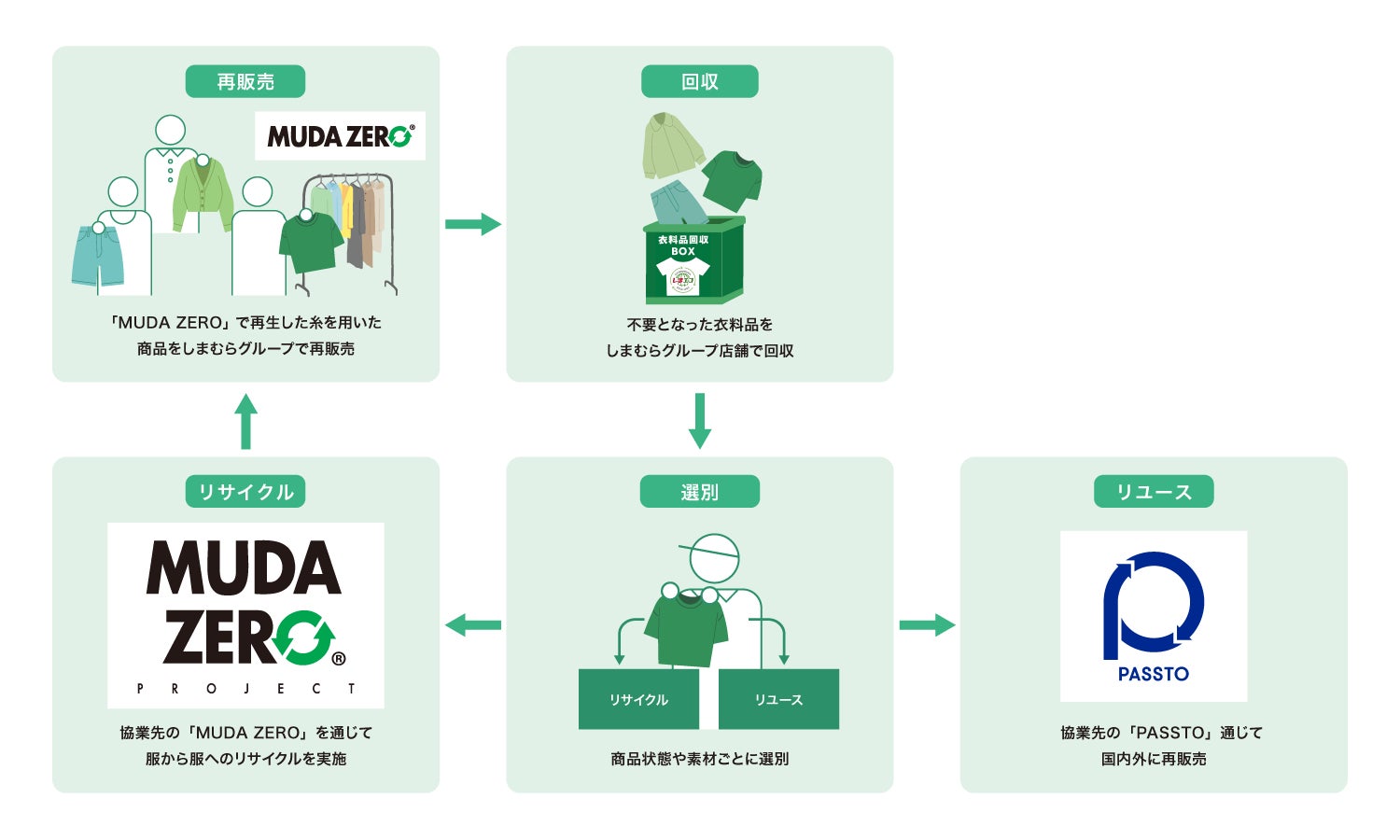 協業先の株式会社カイタックファミリーの「MUDA ZERO(ムダゼロ)」プロジェクトを通じて、服から服へのリサイクル(再生)が行われます。「MUDA ZERO」プロジェクトで再生された糸を使用した商品は、2025年度からしまむらグループで販売しています。