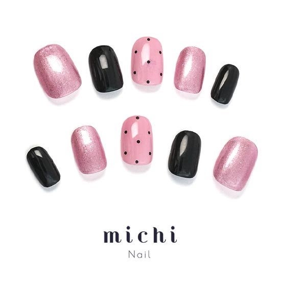 ブラックとピンクの組み合わせがとってもキュートなガーリードットネイル。強めのブラックとドット柄が可愛いデザインです。ちょっぴりダークな雰囲気で、ライブなどのイベントに付けていきたいネイルチップです。