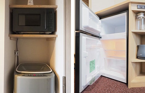 全室に洗濯機、2ドア冷蔵庫、電子レンジを完備。コンビニ1分、サウナに大浴場。“あったらいいな”が叶う、嬉しいMyホテル