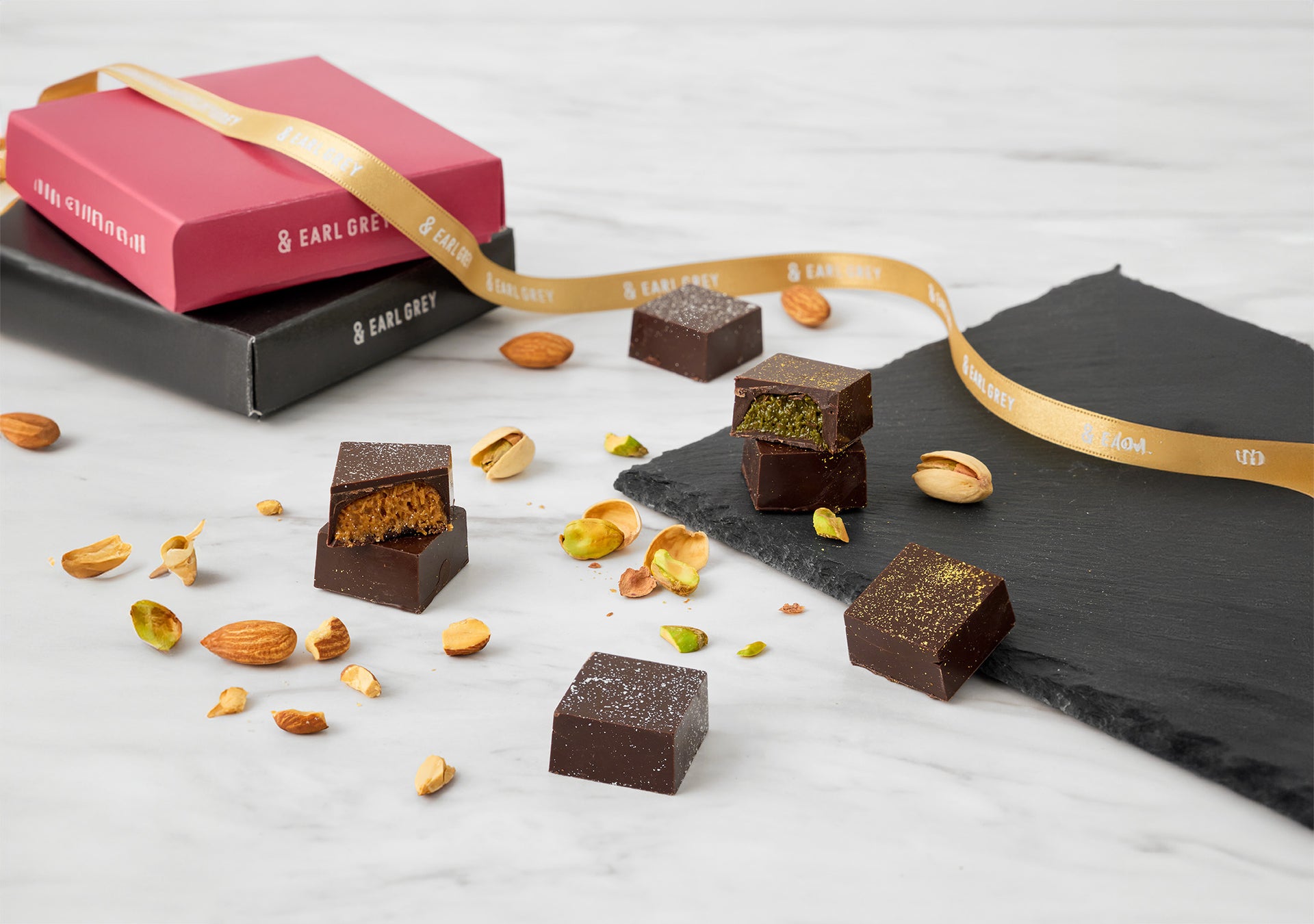 柔らかな甘みとコク、さらにほのかな苦みのバランスが絶妙のアーモンドとザクザクとザクザク食感を楽しめる、& ARL GREY オリジナルドバイチョコ。