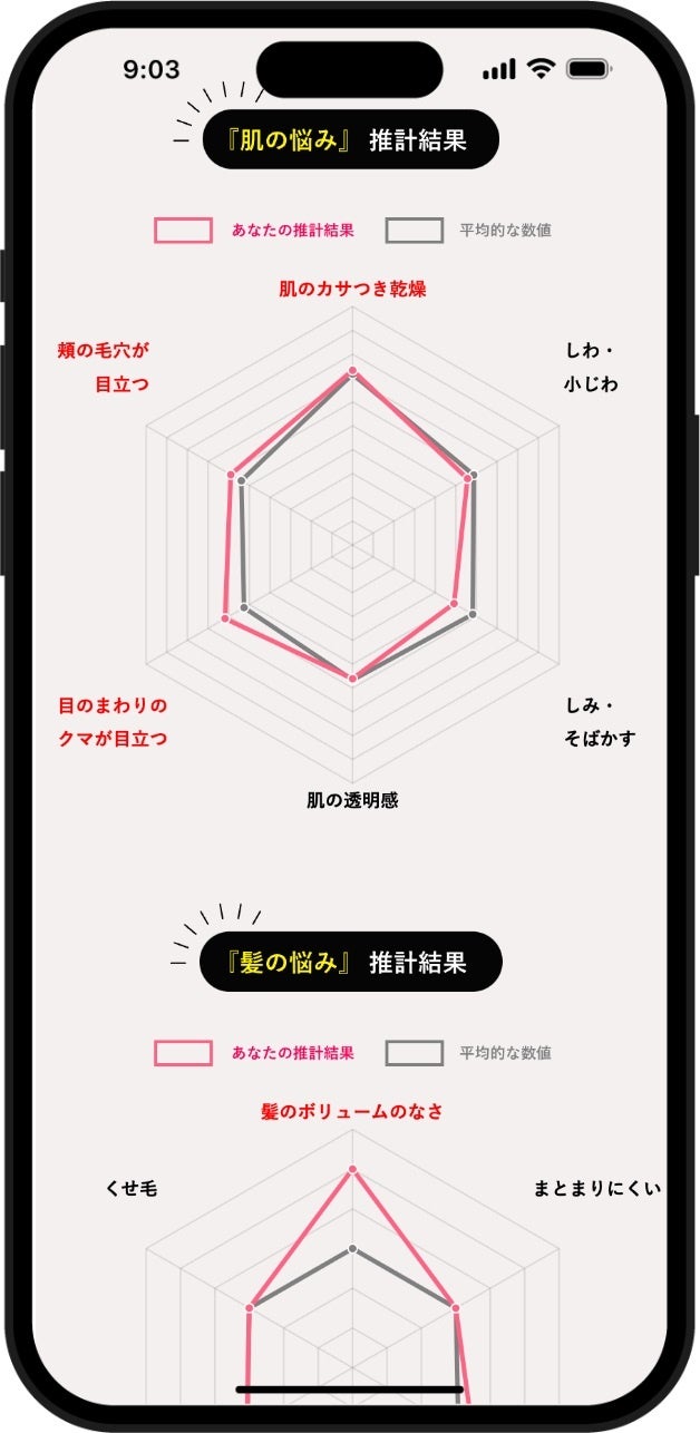 『Beauty Chart』は、食事内容、栄養バランス、睡眠の質、運動の頻度などの要素を総合的に評価し、これらの要素と髪や肌の問題との関連性を分析することで、美しい髪と肌を維持するために必要な情報を提供します。美容室を訪れたお客さまがご自身の情報を入力すると、アプリが髪・肌の現在の状態を推定。結果をもとに、美容師から効果的なケア方法など、未来の美しさにつながるアドバイスが得られます。