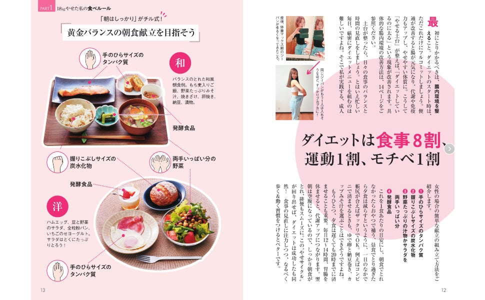 本書を手に取っていただいて、 ありがとうございます! 私は目標だったマイナス18㎏を産後から1年3か月で達成しました。その喜びをたくさんの方と共感したくてSNSをスタート。やせてよかったと思うのは、なんといっても自分を好きになれたこと。いつも身体を隠してばかりだった私が、ダイエットをSNSで発信するなかで「“誰か”らしくじゃない、私らしく」と、心から思えるようになりました。さらに、きちんと食べて楽しく動いている今は、フィジカルもメンタルも私史上いちばん調子がいいと実感しています。
