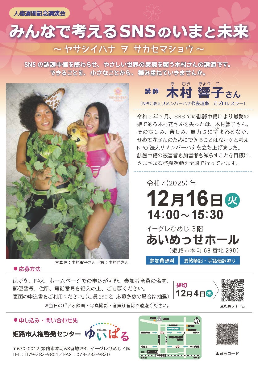 令和7年度人権週間記念講演会「みんなで考えるSNSのいまと未来-ヤサシイハナ ヲ サカセマショウ-」を実施します。