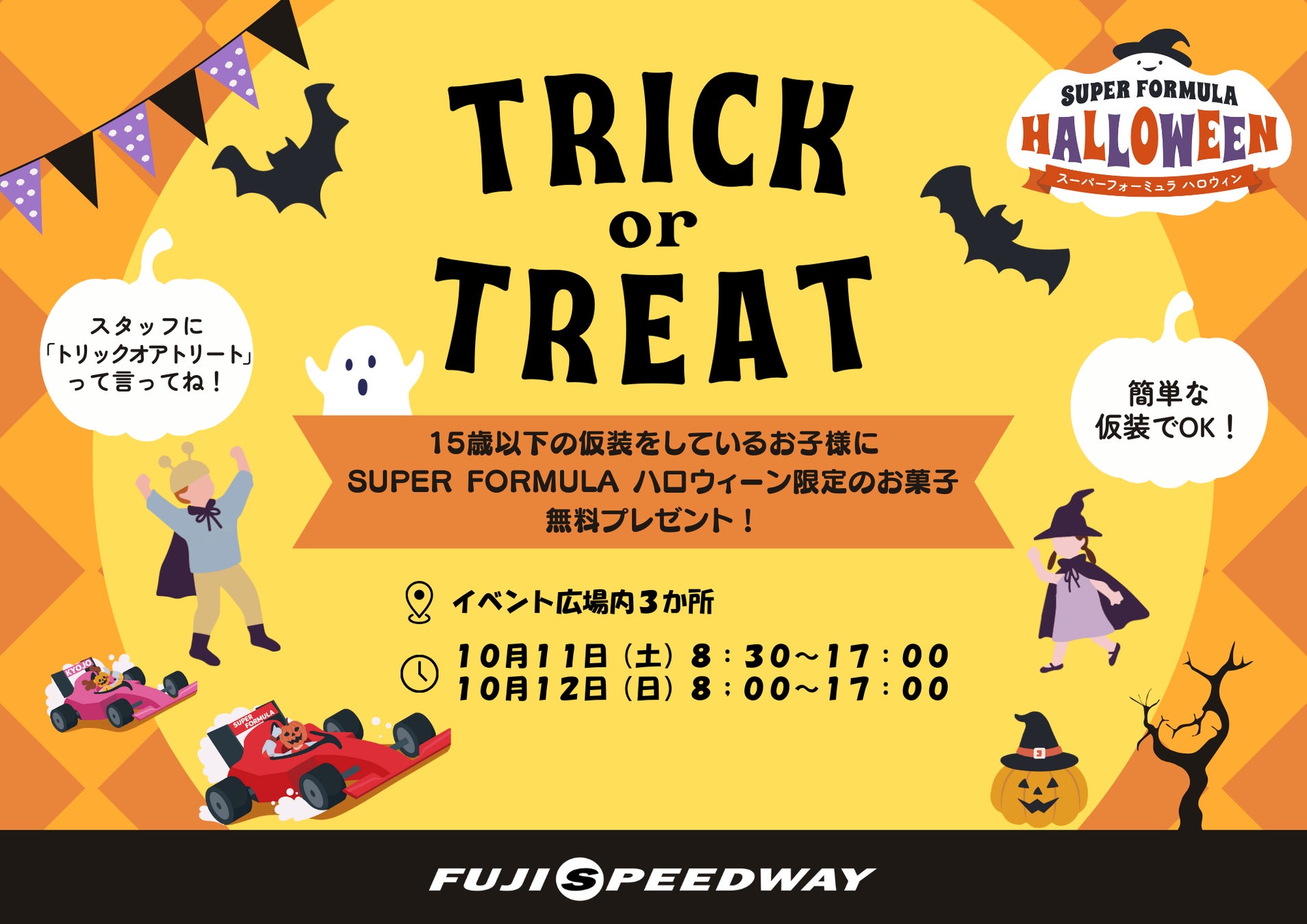 イベント広場内の対象ブース(富士スピードウェイオフィシャルショップ・スタンプラリーブース・フェイスシールブース)でスタッフに「トリックオアトリート!」と言うとお菓子がもらえちゃいます!