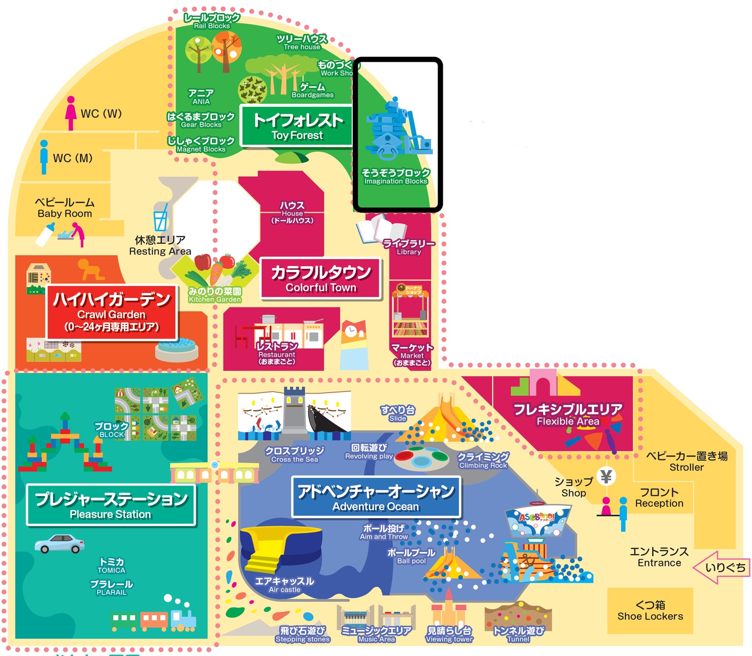 フロアは、海のエリア(アドベンチャーオーシャン)、森のエリア(トイフォレスト)、街のエリア(カラフルタウン)、駅のエリア(プレジャーステーション)、ベビー専用エリア(ハイハイガーデン)の5つのエリアにわかれています。