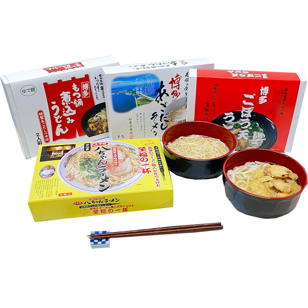 福岡・博多で人気のラーメンとうどん(生麺)を集めたセットです。「八ちゃんラーメン 4食入」「博多ごぼう天うどん 3人前」「博多あごだしラーメン 3人前」「博多もつ煮込みうどん 2人前」のセットに、記念ノベルティとして「NewDaysエコバッグ」がついてきます。気軽にご自宅で、九州の味をお楽しみください。