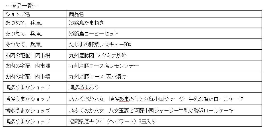 第一弾として提供する商品はJAタウンのショップ「あつめて、兵庫。」の「淡路島たまねぎ」、「博多うまかショップ」の「博多あまおう」・「福岡産キウイ」、「お肉の宅配 肉市場」の「九州産豚肉 スタミナ炒め」などJAタウンならではの商品をご用意しています。