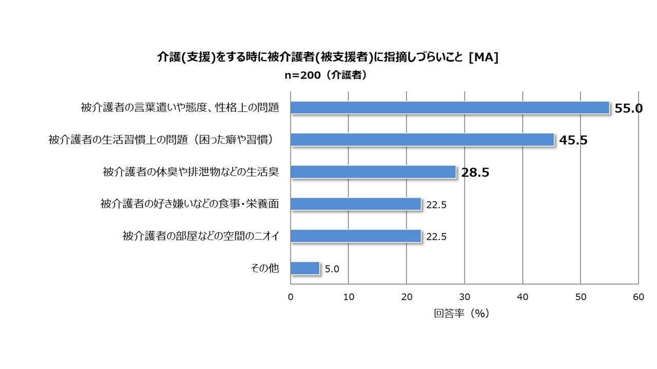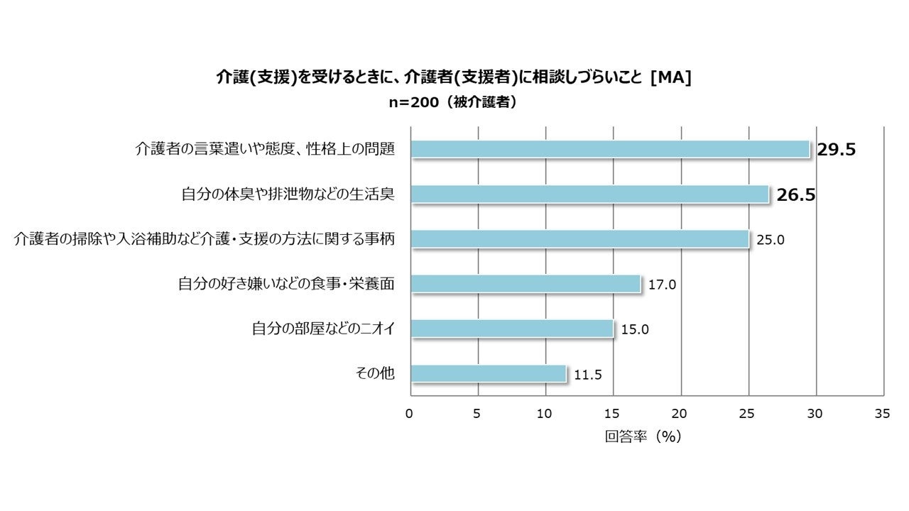 一方で、指摘しづらい事柄も存在し、介護者では「言葉遣いや態度、性格上の問題(55.0%)」「生活習慣上の問題(45.5%)」「体臭や生活臭(28.5%)」、被介護者では「言葉遣いや態度(29.5%)」「自分の体臭や排泄物(26.5%)」が上位となり、双方ともパーソナルな問題には配慮や我慢も一定数生じていることが分かりました。