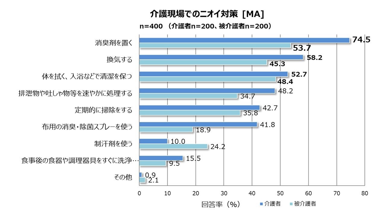 具体的なニオイ対策については、介護者も被介護者も上位から「消臭剤を置く」「換気する」「体を拭く、入浴などで清潔を保つ」となり、積極的に対策をしていることが判明しました。また、消臭剤を置くことは、両者ともに取りかかりやすい対策であると考えられます。特に居宅介護サービスの場合、被介護者で消臭剤を置く対策を取る人が多い結果となりました。
