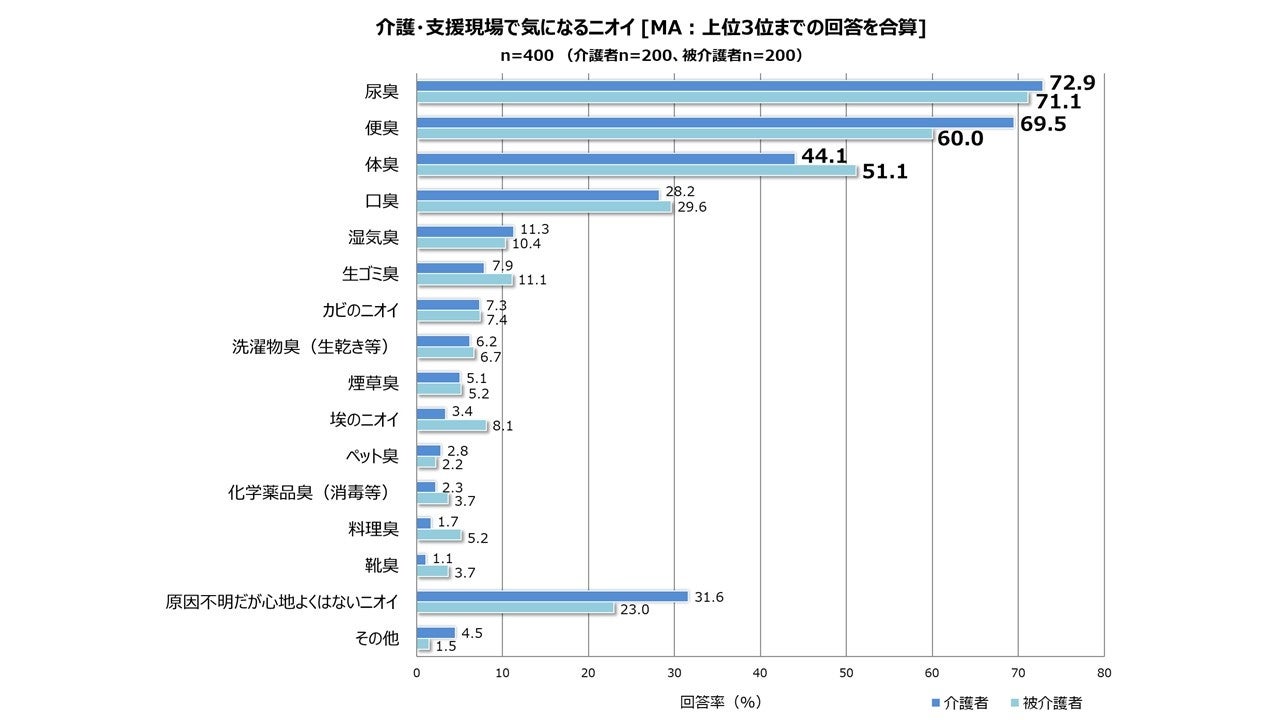 介護者と被介護者が介護現場で気になるニオイTOP3は、上から順に「尿臭」「便臭」「体臭」と同様の結果となりました。介護にまつわるニオイは介護者側のお悩みという印象を持たれることが多い中、被介護者も同様のニオイを認識し、気になっていることが分かります。