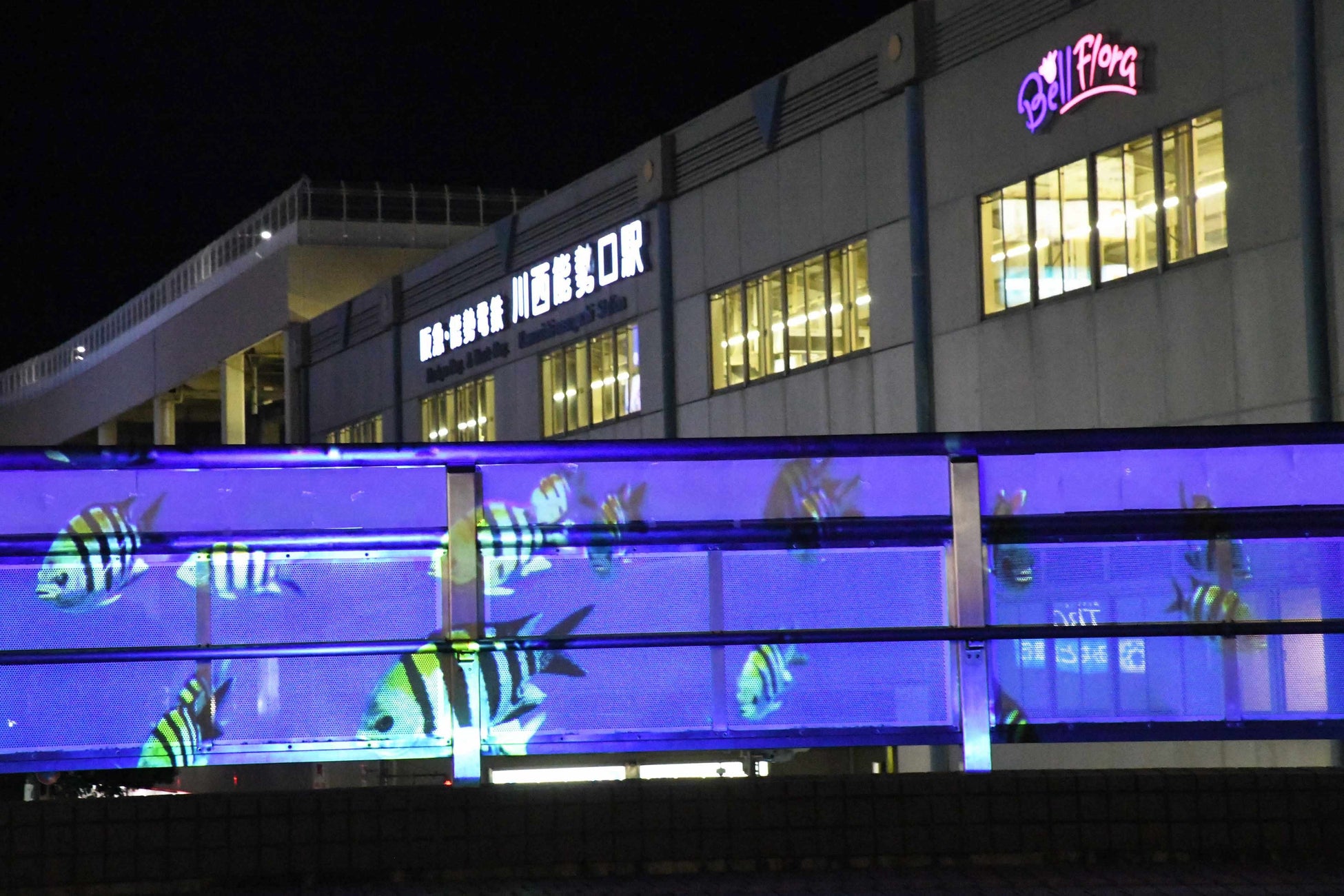 すでに、川西能勢口駅前南広場西側歩行者デッキ天井全面や植栽には、シールによるバーチャルアクアリウムが設置されています。