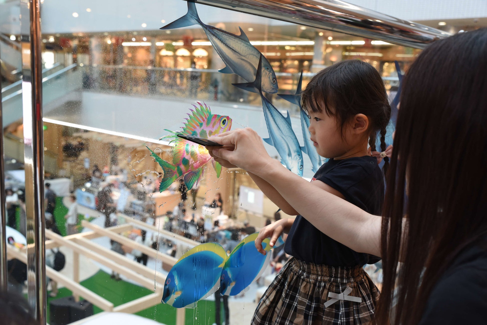 これは、市内在住 3~12歳の子ども20名と一緒に自由な海の世界を制作しようというコンセプトで、2階フェンス部分へみんなでシールを貼る取り組みです。