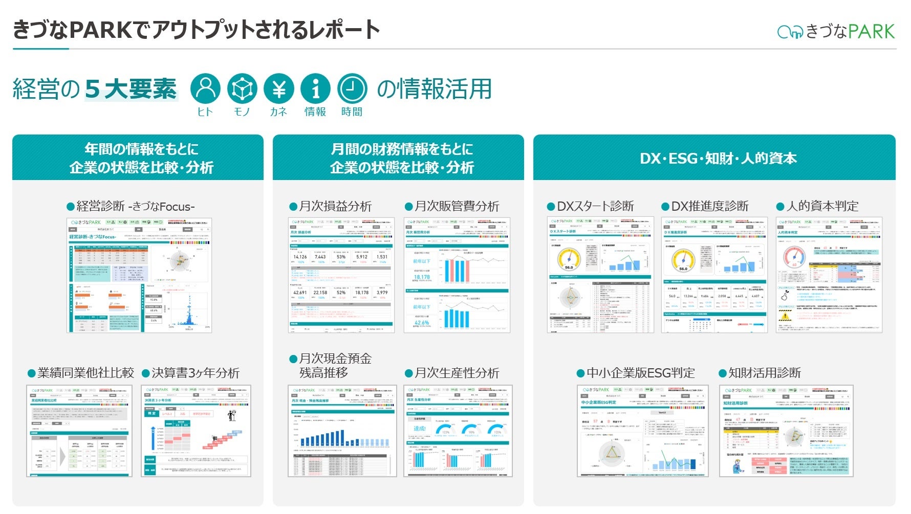 まず、「きづなPARK」では、企業の経営情報をデータとして収集・蓄積し、ヒト・モノ・カネ・時間・情報といった経営リソースを財務・非財務の両面から可視化・分析します。さらに、BIレポートの出力機能を活用し、中小企業版ESG判定レポートを提供。脱炭素の視点から経営改革に向けた具体的な提言を行います。