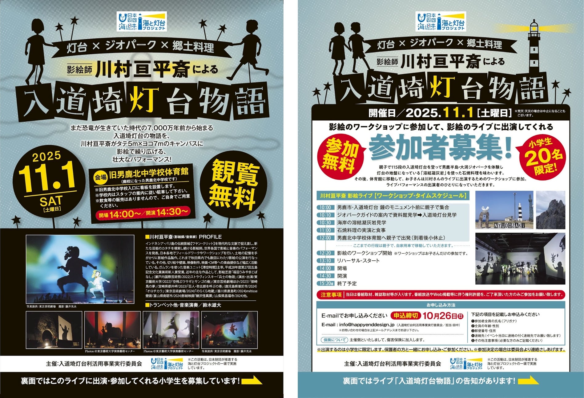 入道埼灯台利活用事業実行委員会は、2025年11月1日(土)影絵作家・川村亘平斎による「入道埼灯台物語」を開催いたします。このイベントは、日本財団「海と日本プロジェクト」の一環として、灯台を中心に地域の海の記憶を掘り起こし、地域と地域、異分野と異業種、⽇本と世界をつなぎ、新たな海洋体験を創造していく「海と灯台プロジェクト」の助成を受けて実施します。
