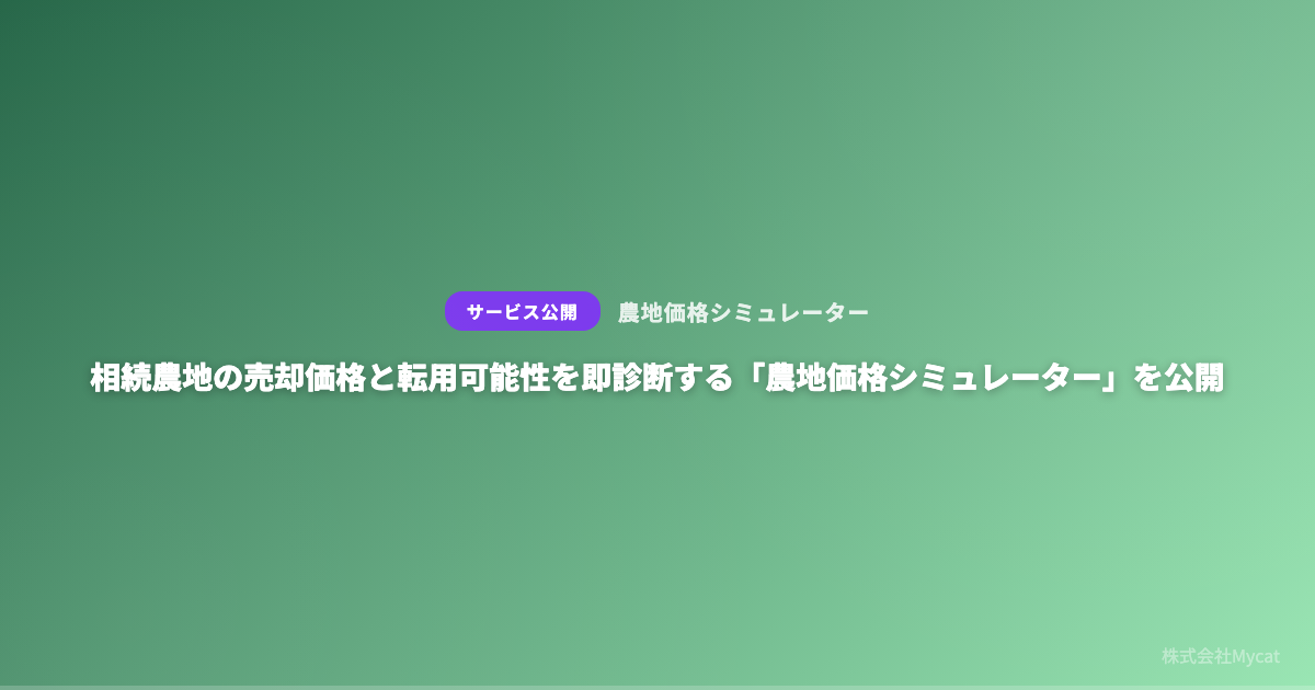 株式会社Mycat(本社:東京都目黒区)は、都道府県・地目(田/畑)・面積を入力するだけで農地の売却相場と転用可能性を即時に診断できるWebサービス「農地価格シミュレーター」(https://nouchi.xyz)を公開いたします。