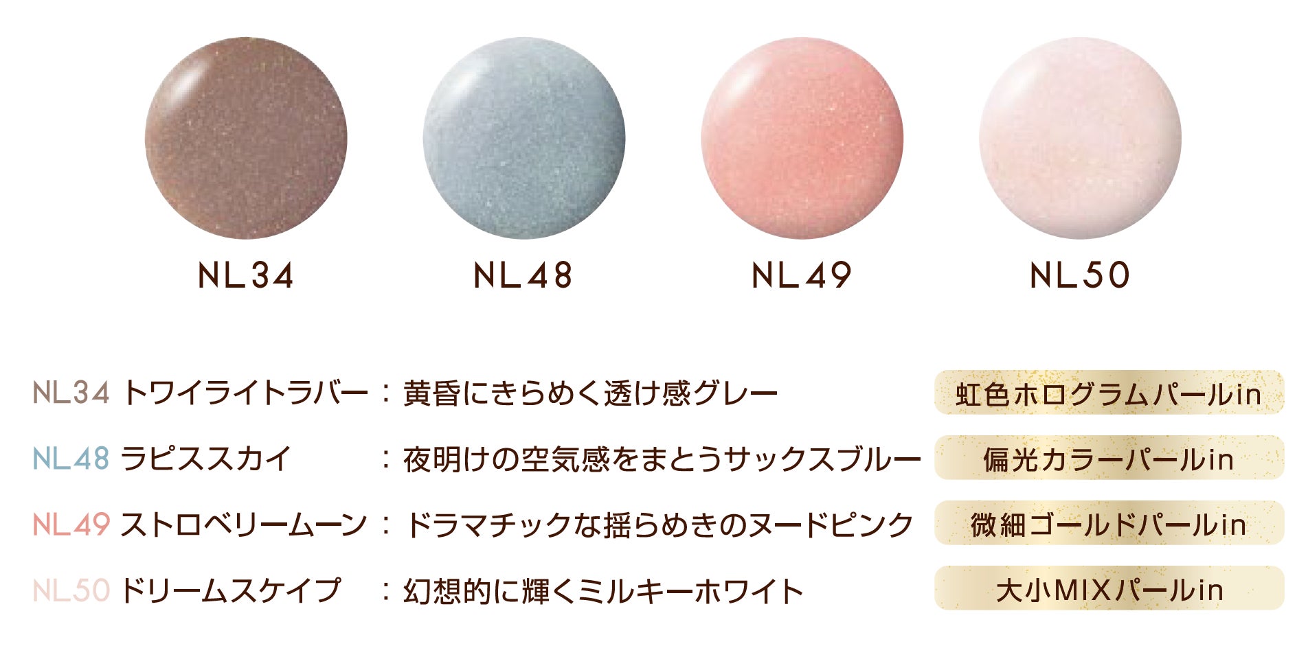 このたびの新色は、“星空ネイル”をテーマに星がきらめく満天の空をイメージしたラインナップです。「NL48(ラピススカイ)」は偏光カラーパールを配合したサックスブルー、「NL49(ストロベリームーン)」は微細なゴールドパールがドラマチックに揺らめくヌードピンク、「NL50(ドリームスケイプ)」は大小MIXのパールが幻想的に輝くミルキーホワイト。それぞれ異なる色や質感のパールやラメを配合しており、きらめき方も異なります。また昨年2月にオンライン限定発売後、公式オンラインショップをはじめ、複数のショップで早期に完売した人気色「NL34(トワイライトラバー)」を、定番化のご要望のお声を多数受け、この度定番色として再販いたします。虹色ホログラムパールを配合し、黄昏にきらめく透け感グレーで指先を彩ります。目を惹く華やかな輝きでありながら、日常使いしやすいカラーリングです。