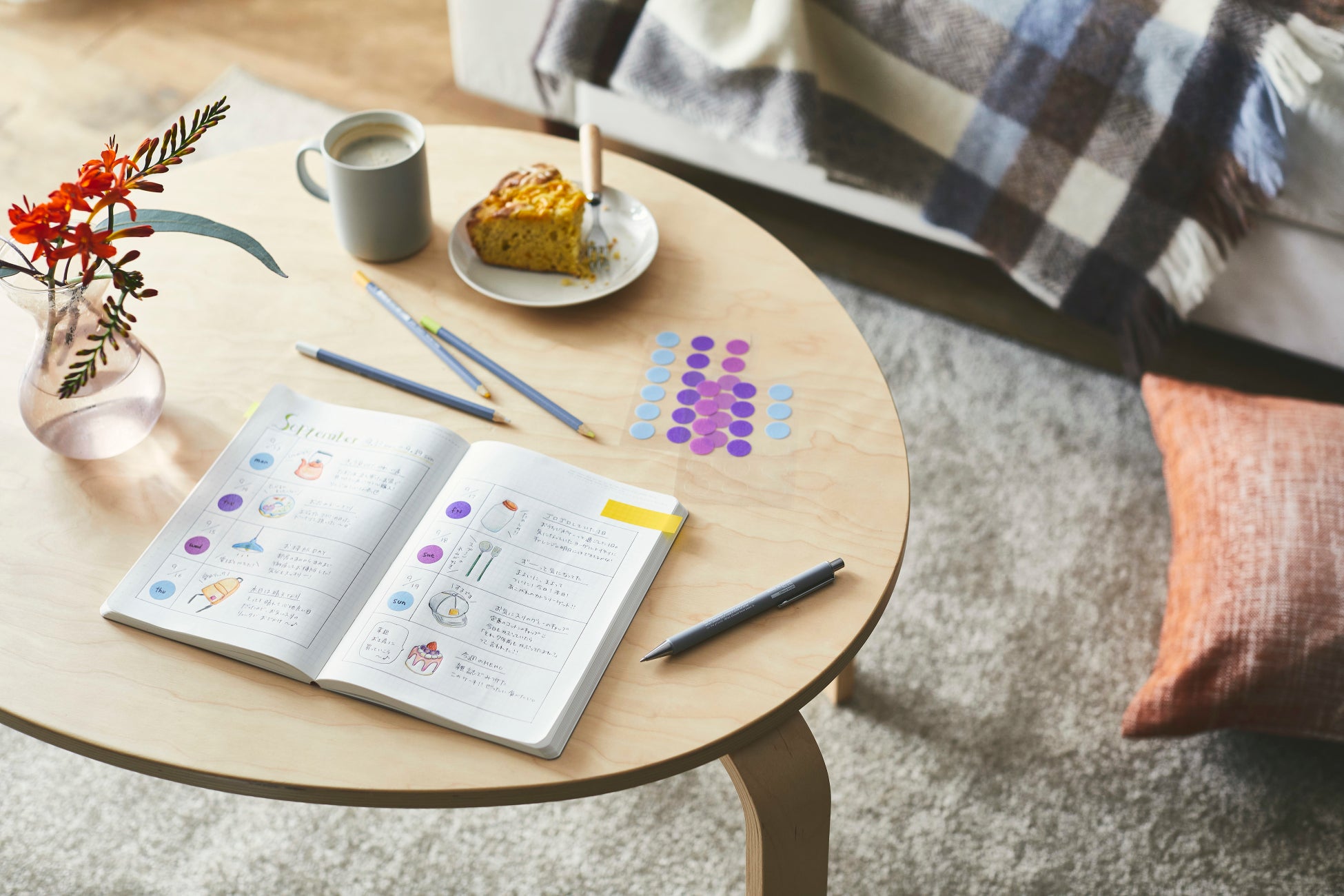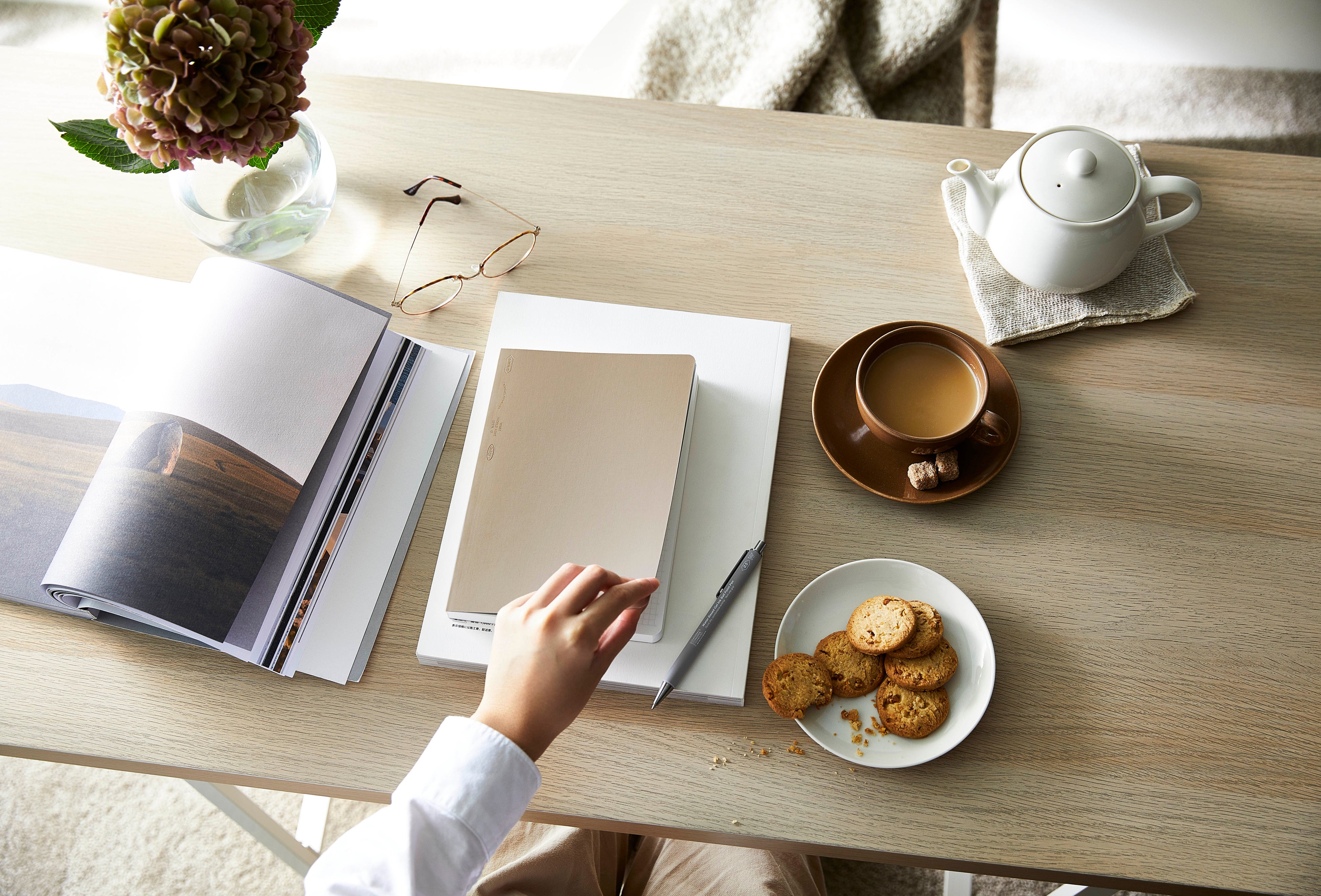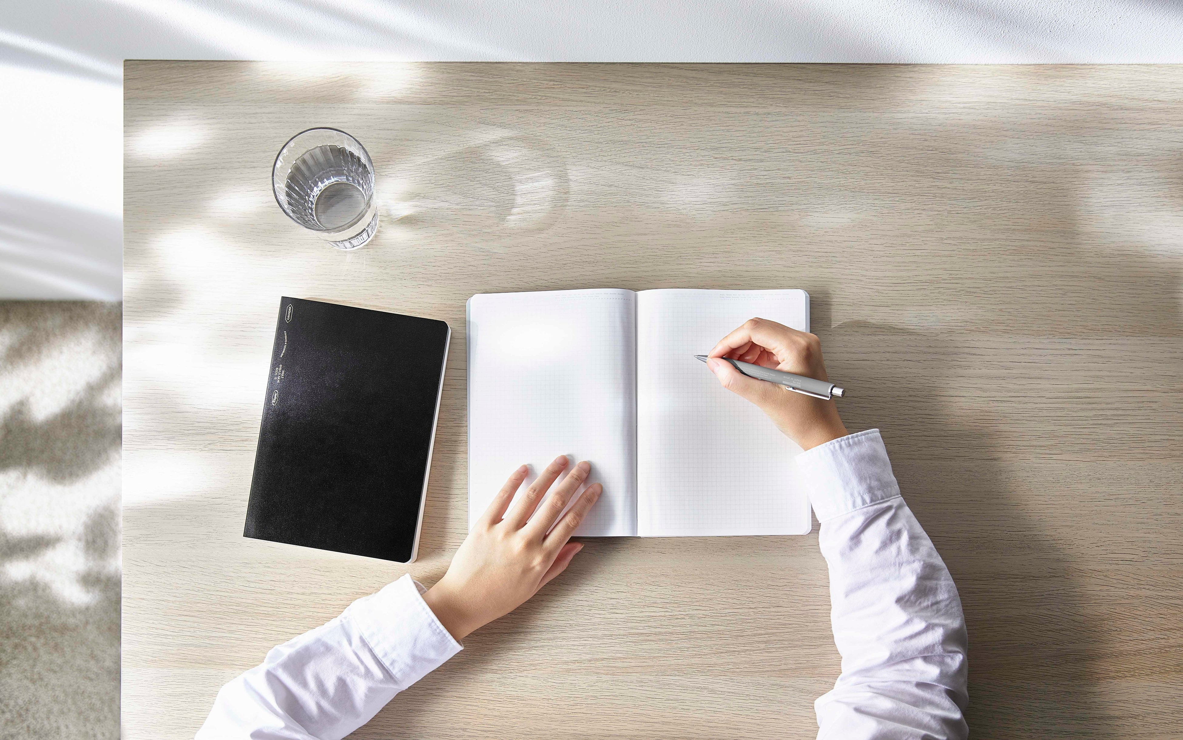 シンプルで自由度の高い「365デイズノート」のデザインはそのままに、ページ数を192ページにした半年分の記録に適したノートです。薄くて軽いので用途別に2冊使いもしやすく、オフィスやカフェ、旅先など、どこにでも持って行きやすい厚さです。