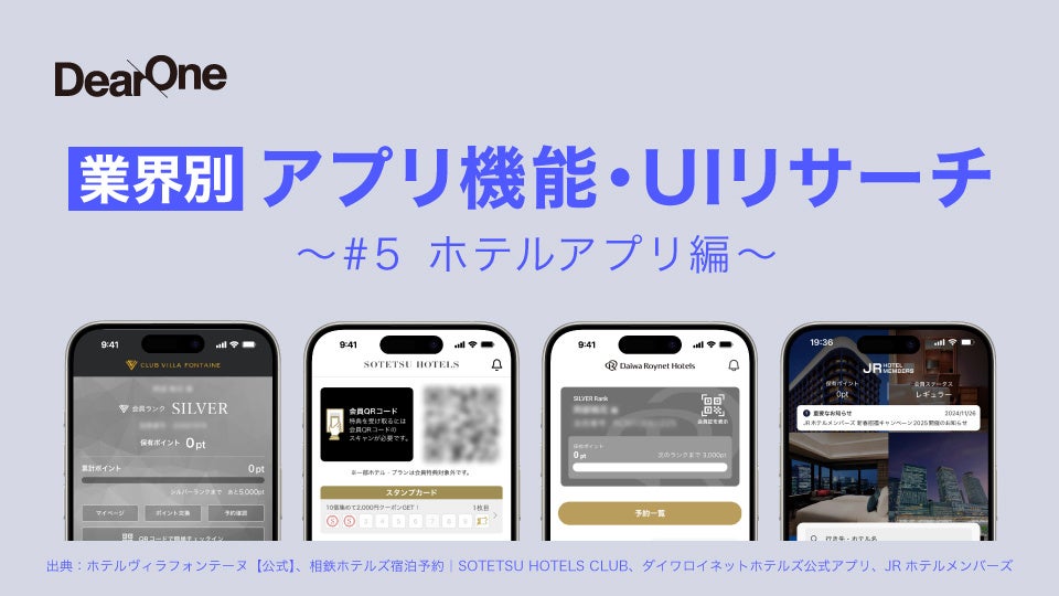株式会社NTTドコモのマーケティング分野における新規事業型子会社である株式会社DearOne(本社:東京都港区、代表取締役:河野 恭久、以下:DearOne)は、アプリ開発会社の観点から、他社アプリのUI/UX、機能のレビューをコンセプトとした「業界別 アプリ機能・UIリサーチ~#5 ホテルアプリ編〜」を公開いたしました。