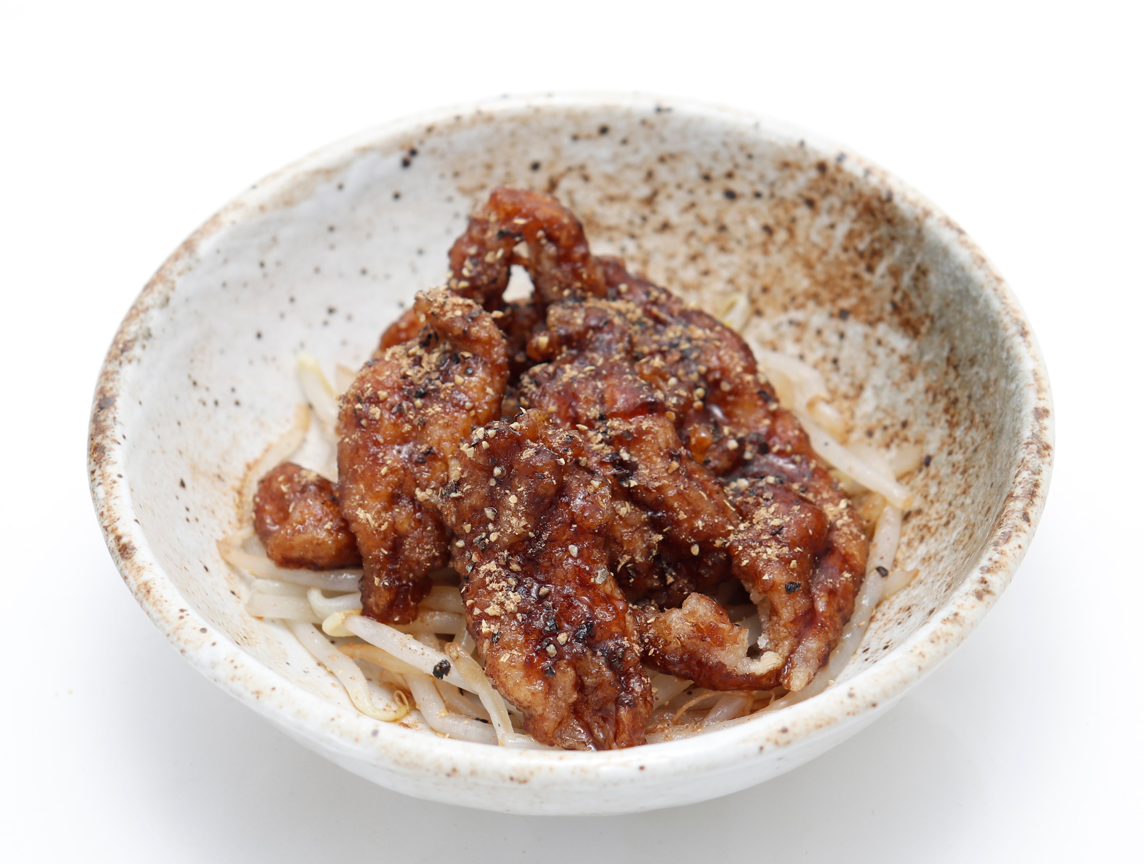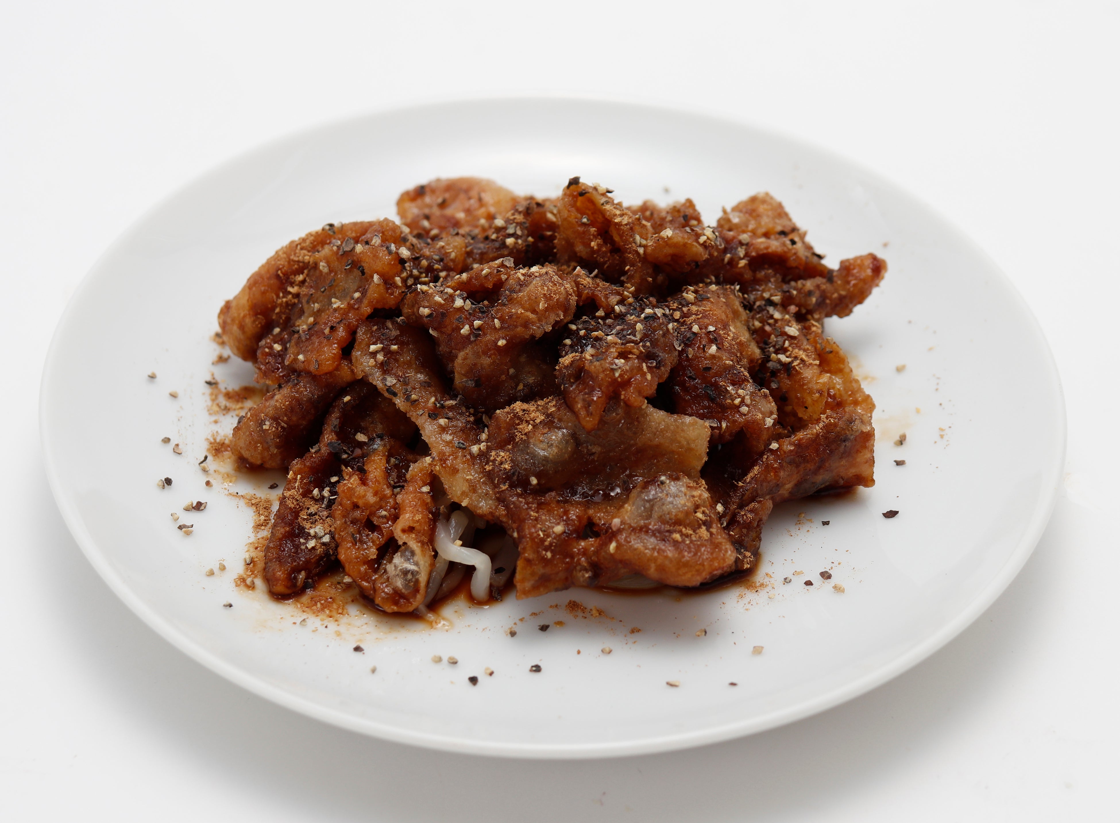 ソースにたっぷり漬け込んだ揚げた鶏皮を山椒と黒胡椒でスパイシーに仕上げました。