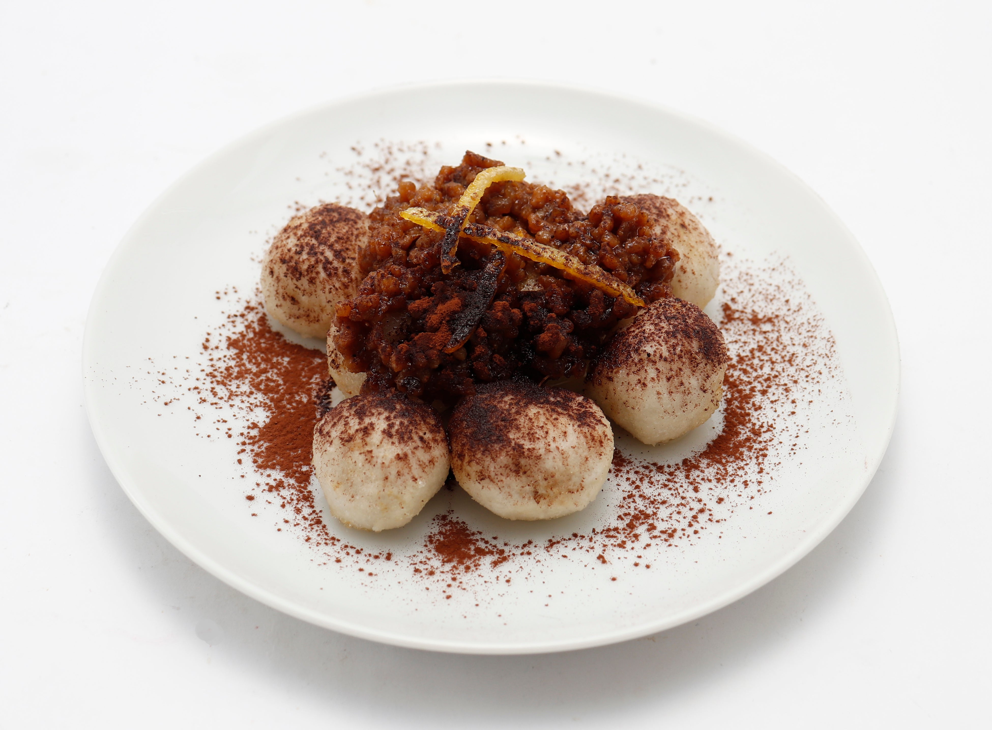 揚げた里芋と肉味噌の素朴な組み合わせに仕上げのココアパウダー。甘辛にココアの風味のアクセント。