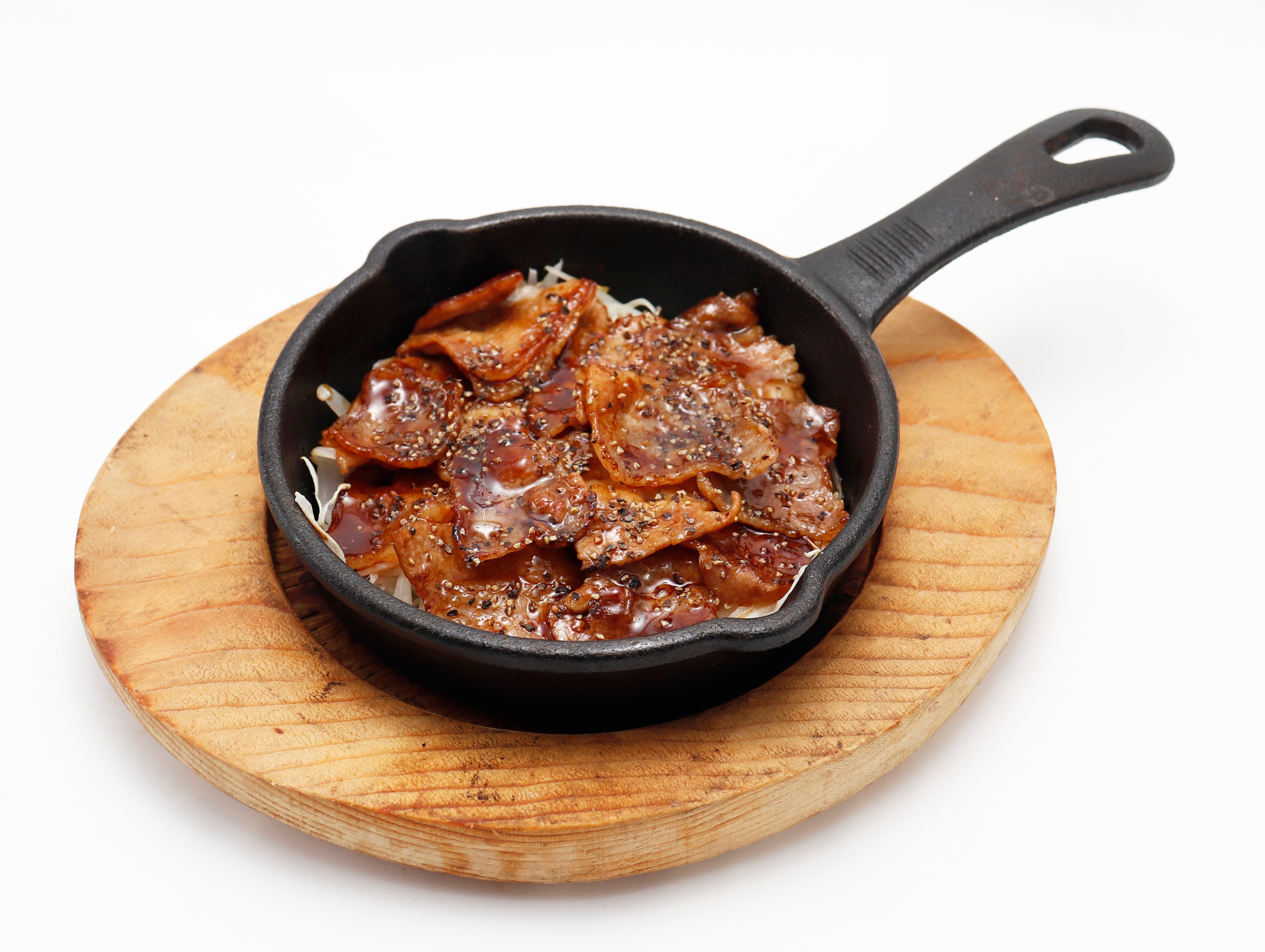 豚バラを黒い甘辛タレに絡め、ブラックペッパーでアクセントを加えました。
