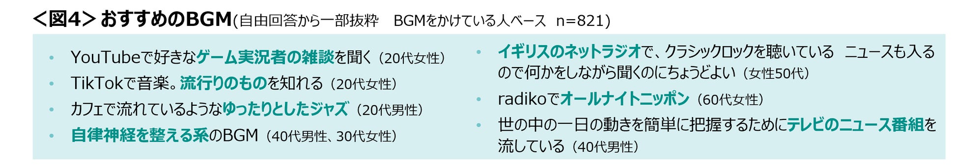 リラックスや気分上昇の目的以外にも、「何か音がしていないと寂しいから」「気分を切り替えたいから」も約2割と、その時の状況や環境・なりたい気分に合わせてBGMを流していることがうかがえる。