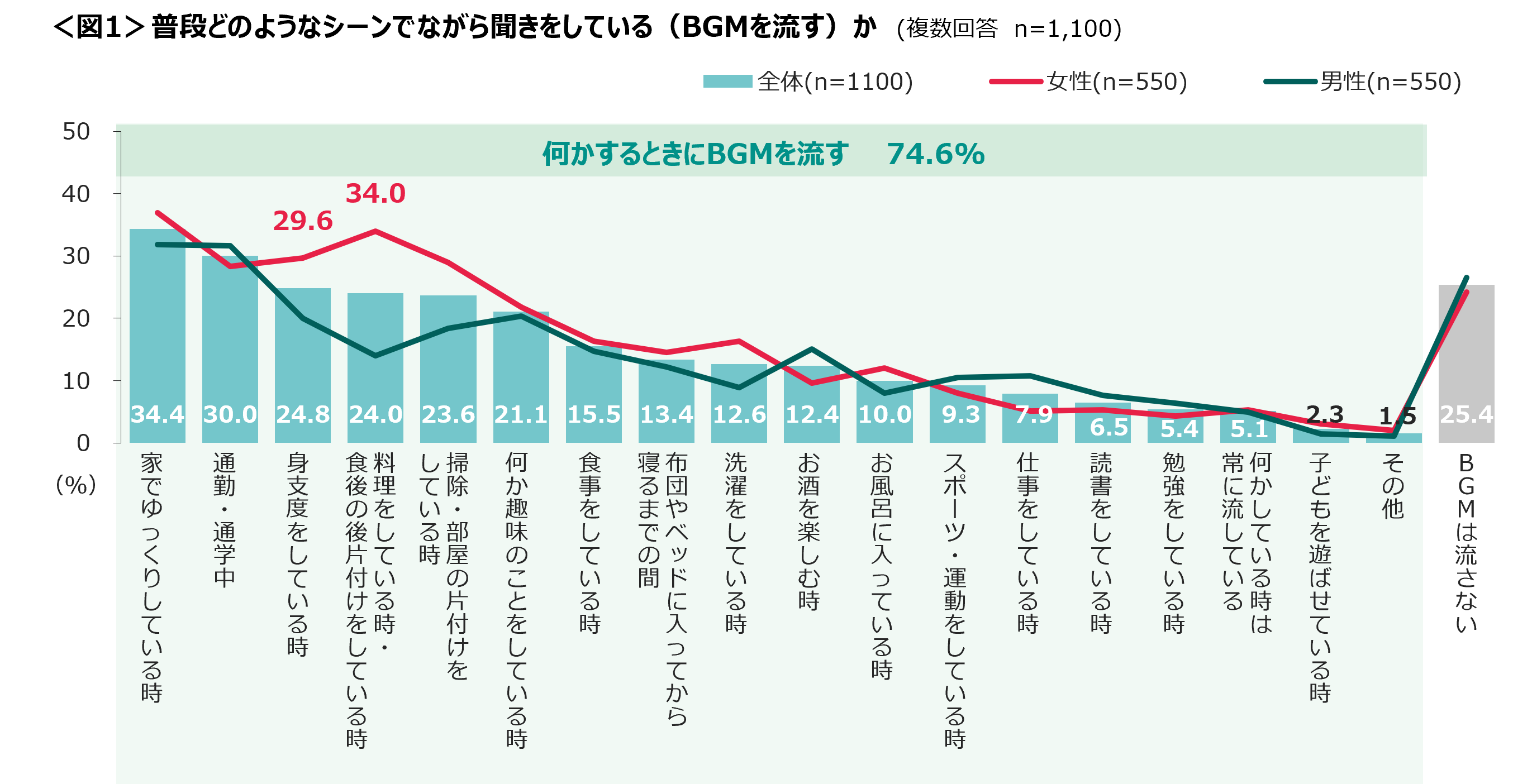 何かをしながらBGMとして音楽などを流す人は74.6%と、4人に3人は“ながら聞き”をするという結果に。BGMを流すシーンは「家でゆっくりしている時」が34.4%でトップ。<図1>