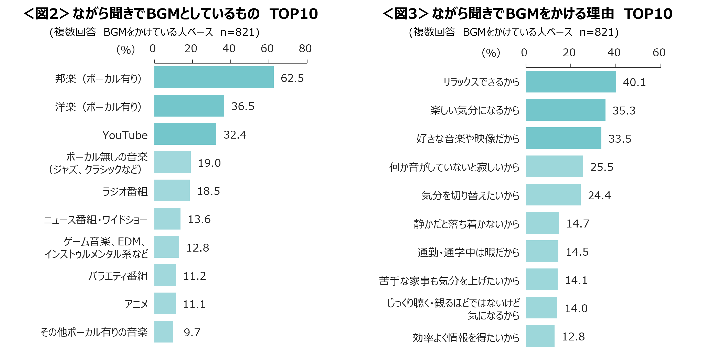 ながら聞きでBGMにしているものは「邦楽(ボーカル有り)」が6割超でトップ。<図2>